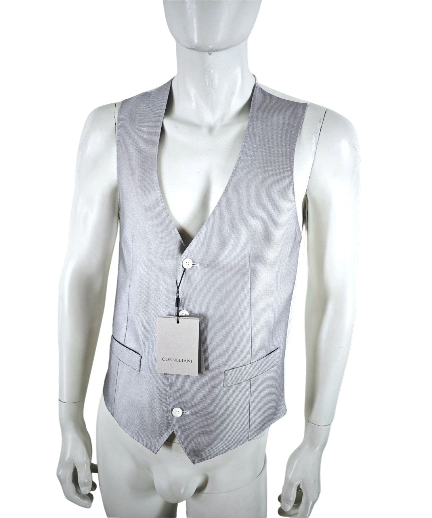Elegant and luxurious gilet from the renowned Italian brand Corneliani. Crafted from 100% silk, this waistcoat offers a refined texture and sophisticated appearance, making it an excellent choice for both formal occasions and elevated smart-casual outfits.
